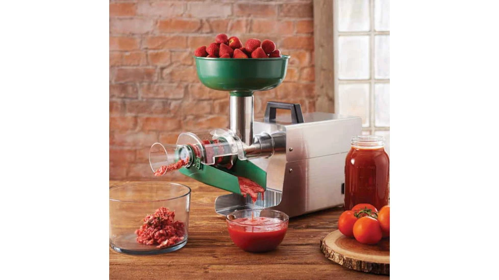 Expand the possibilities of your Big Bite Grinder with the Big Bite Juicer Attachment. Easily make fresh juice, puree, baby food, tomato sauce, jam, or jelly without the hassle of peeling or seeding fruits or vegetables! Stainless steel head and screen for increased durability. The screen has a rubber plug and graduated holes to maximize juice extraction on the first pass. Juice will be extracted into one bowl, and the seeds and peels will be discarded into a separate bowl (please note: Will not juice chokecherries or other fruits with seeds or pits larger than 3mm (1/8in). Peels must be removed from citrus fruits such as lemons, limes, and oranges). Includes its own pan and stomper. Easy to assemble and disassemble for cleaning.![]()