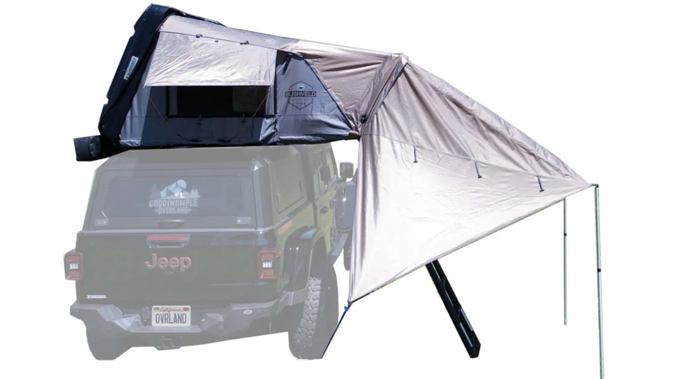 When youre looking for a quick and simple-to-install awning, you came to the right place. This awning does not use brackets, but instead zips directly into our Bushveld tent. No drilling or modifications required. Our Bushveld covers are manufactured out of material that has heat sealed seams to ensure youre not going to see any leaks through the seams regardless of the size of rain youre dealing with. When its time to stow your Bushveld Awning away it takes minutes to break down.![]()
