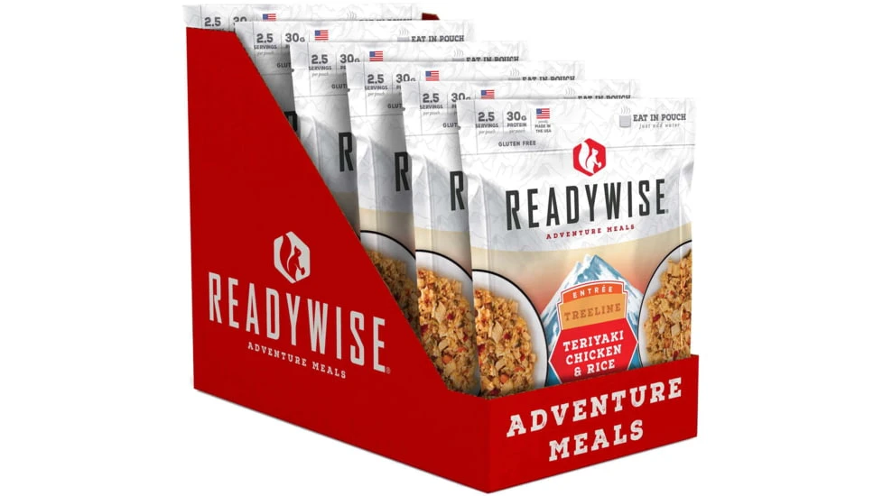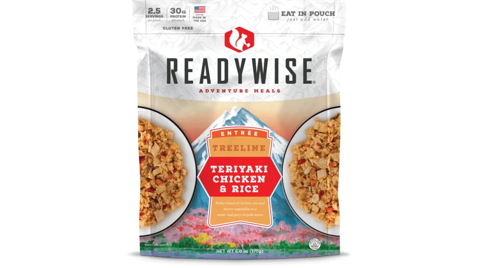 Each pouch of ReadyWise Treeline Teriyaki Chicken & Rice contains 2.5 servings and is resealable. These pouches are lightweight making them easily portable on any outdoor adventure. Just add water and you can eat directly from the pouch.![]()